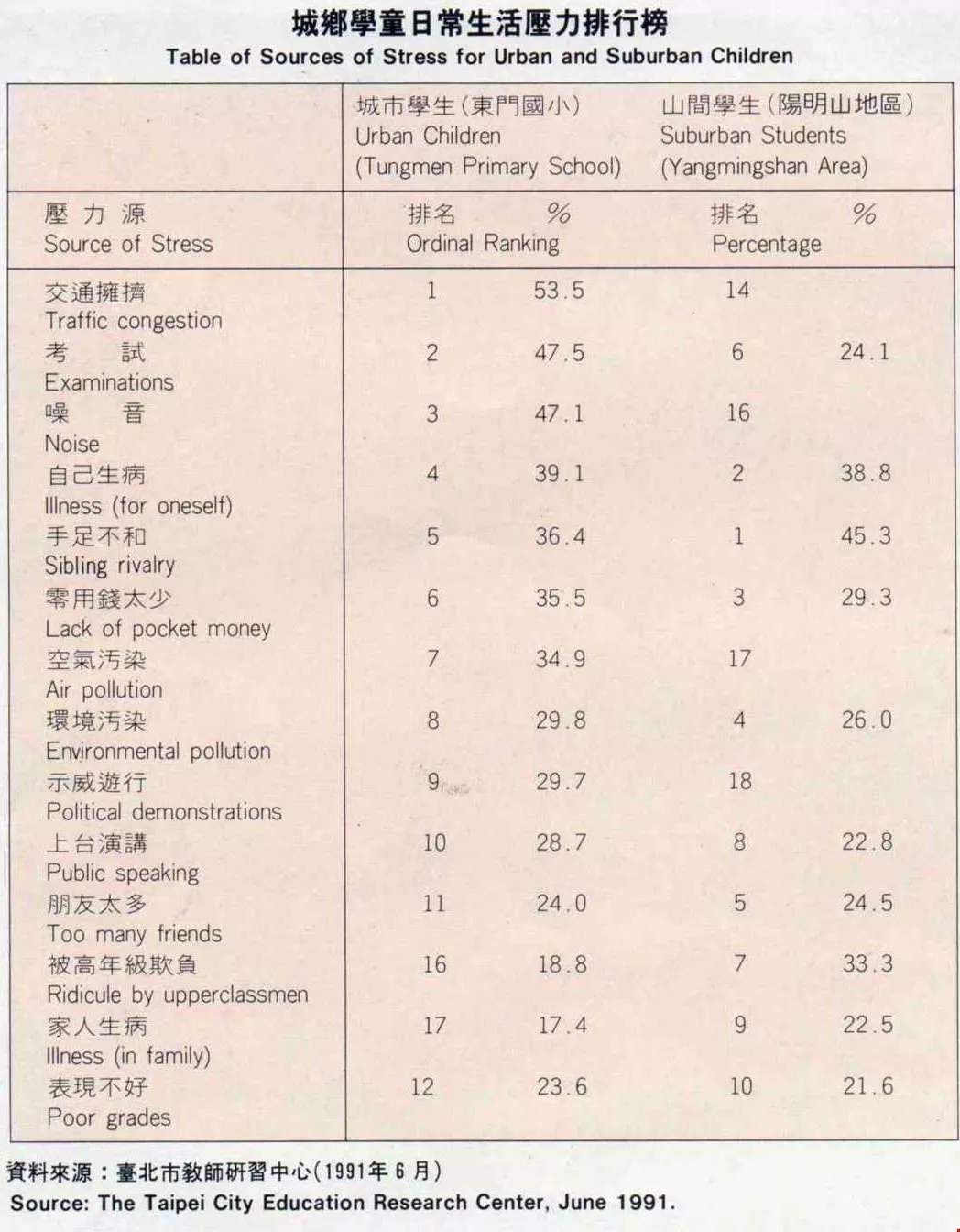北市東門國民小學,曾經做過一份目前北市國小兒童日常生活壓力的研究,分別以位於市區的東門國小五百一十六名學生及陽明山區的四百零三名學生為調查對象,排出了兩組具體的壓力排行榜(附表一)。