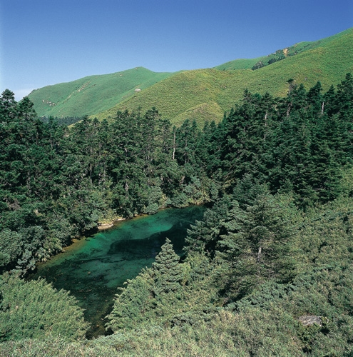 四周被冷杉林包圍的合歡北峰碧池,滿水位時外觀狀似台灣地圖,而有「台灣池」之稱。