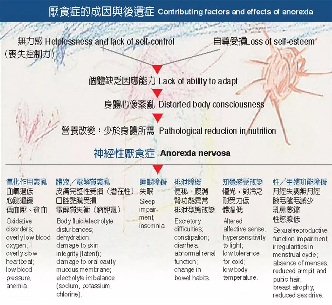 雖然厭食的動機與目的不盡相同,但患者都有追求完美、意志力驚人、缺乏自信、難以維持親密關係等特質,只是她們雖藉由強烈的節食手段達成瘦身目標,卻因此更顯焦慮而伴隨出現憂鬱症、強迫症等疾患,甚至自傷、自殺的行為。