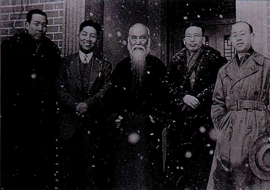 黨國元老于右任也是記者出身,是陸鏗的忘年知交。圖為于右任在競選副總統失敗後,與幾位記者朋友攝於其南京寓所前。(左起劉問渠、陸鏗、卜少夫、樂恕人)(陸鏗提供)