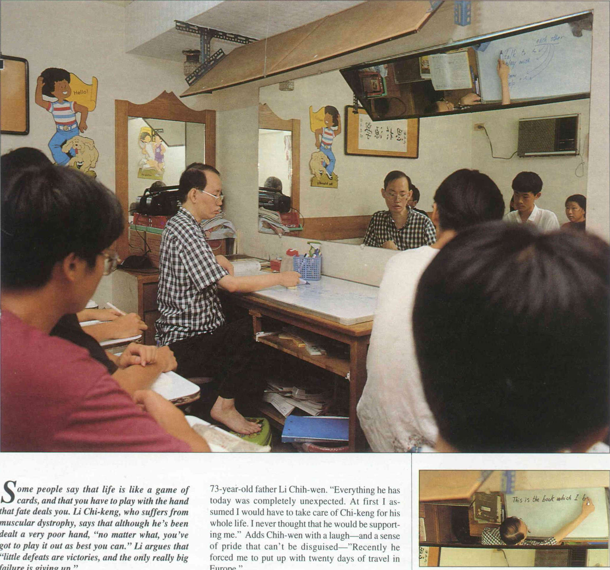 今年七月中旬,李繼庚代表我國的病友赴日本參加第八屆世界肌肉萎縮症聯盟大會。在會中他發表了一卷十五分鐘的生活錄影帶,題目是:「自信的生活——開發中國家一位心中很滿意的貝克型肌肉萎縮症患者」。