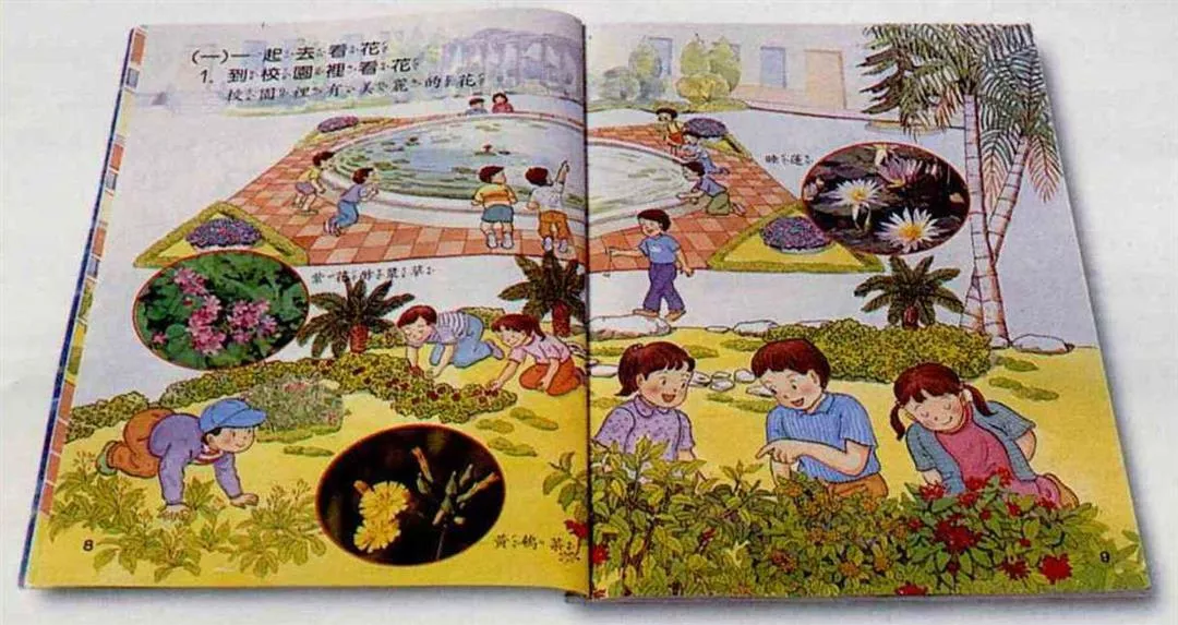 國語科第一冊第一課有「天亮了,太陽出來了。太陽照著我,小狗跟著我,太陽照著我上學,小狗跟著我上學。」」的版本;也有「我是個小畫家,我要畫一座美麗的花園,讓蝴蝶住進來,讓蜜蜂住進來,讓鳥兒從頭到晚唱快樂的歌。」等版本,表現手法很不一樣。