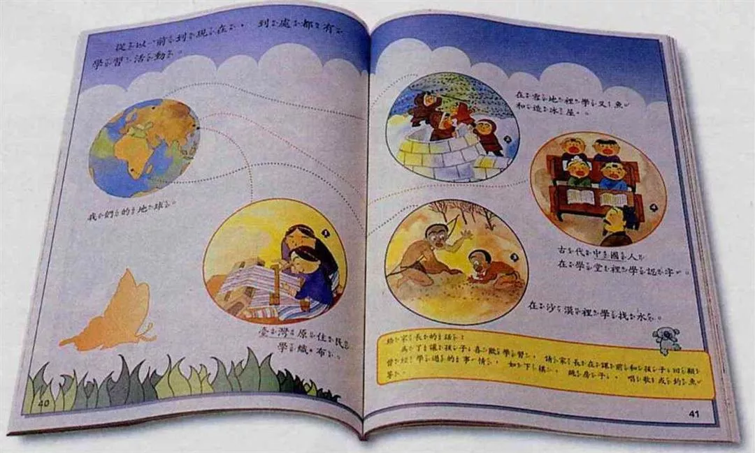 為顧及多元化,社會科課本講「到處都有學習」時,古代中國人在學堂裡學認字、台灣原住民學織布、非洲人在沙漠裡找水的圖繪並存。台灣意識第一