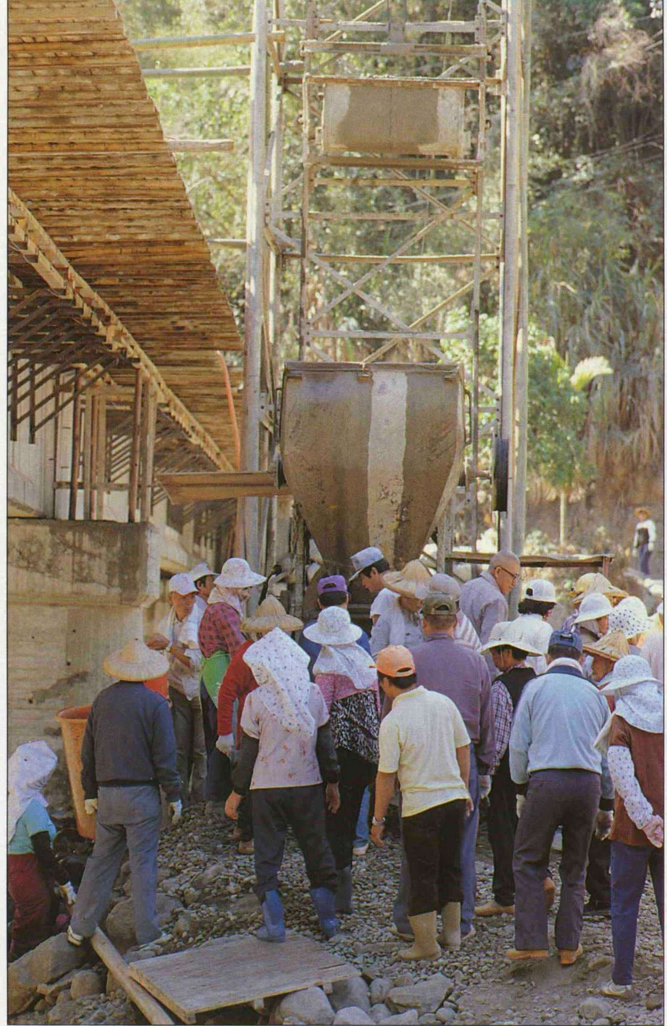 一個早上下來,第一段橋面已經灌漿完成。接下來第二段橋面距離砂石攪拌機器較遠,於是一經吆喝,大夥紛紛登上橋面一字排開,以接力的方式,一桶一桶地傳遞著混凝土漿。