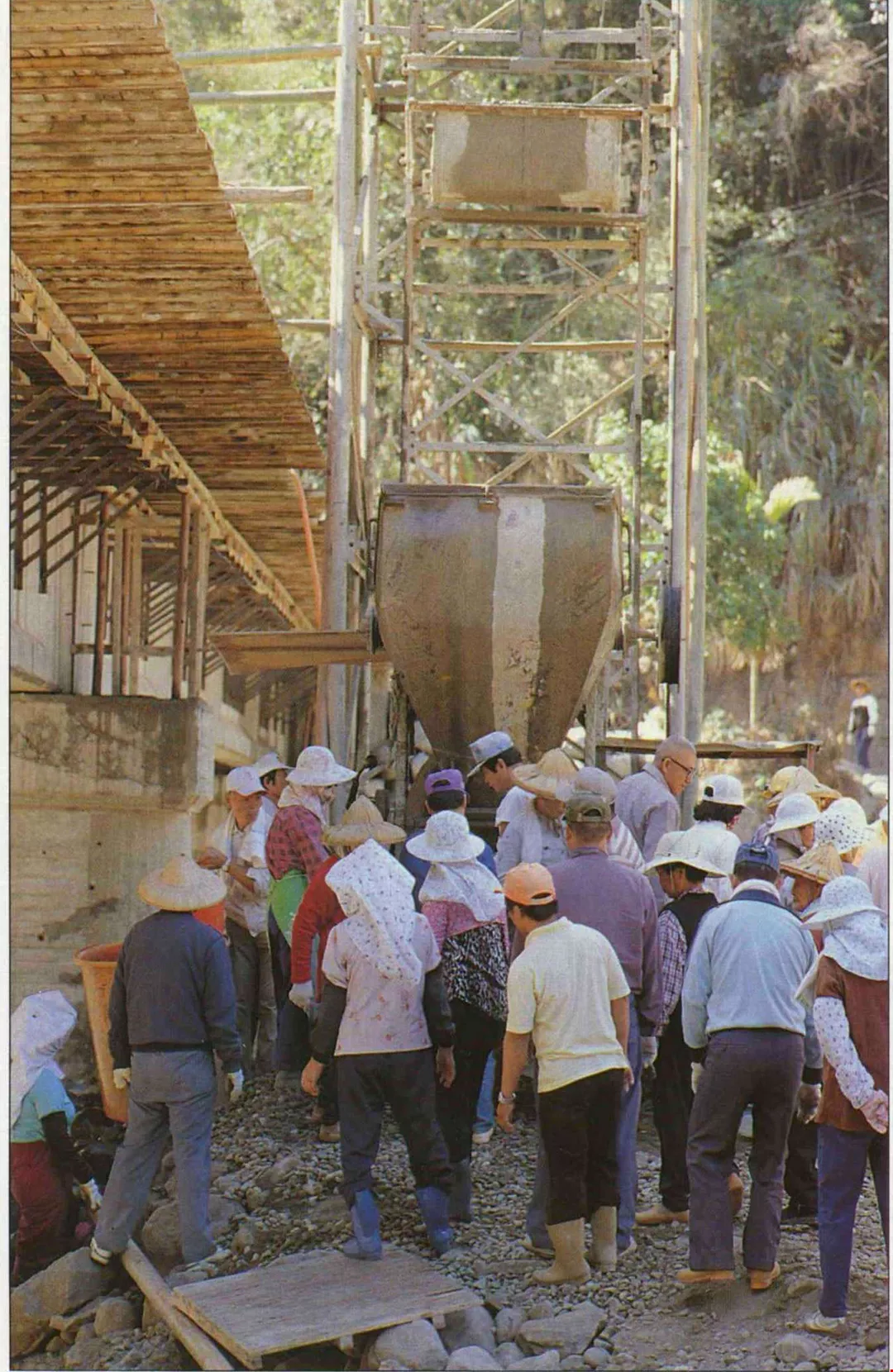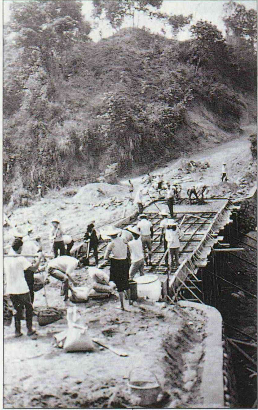 行善團早期篳路藍縷的造橋情形。在二十幾年前,造橋義工大約只有一、二十人。(何明德提供)