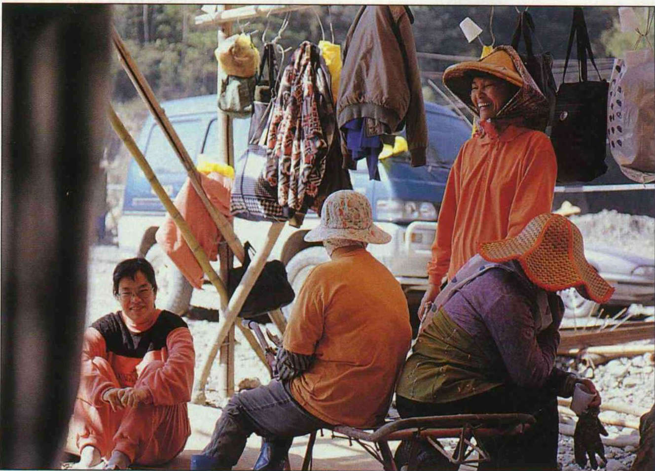 見到不知所措的生面孔,一位熱心的歐巴桑告訴我們:不論是大卡車改裝的工程車、小貨車、還是自用小客車,只要是要去造橋的,都會熱心搭載。
