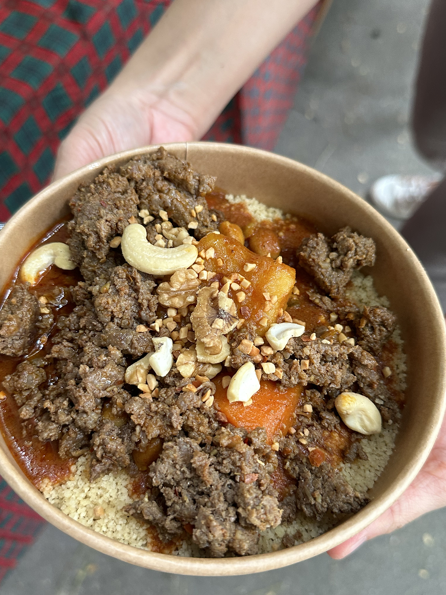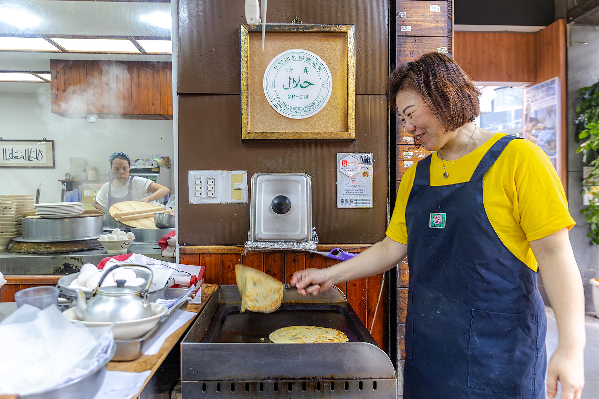 我們到訪時,第二代、也是教親的張亞珍忙著包水餃,每五秒鐘完成一顆,她說,一天少則包上1,500顆。廚房的鍋爐裡是以牛大骨和著茴香、桂皮、八角、花椒等滷包慢火熬煮的中式白湯頭;紅燒湯頭則是加入獨門拌炒的低辣度辣油,再加一勺糖中和,不嗆不辣,口感溫順,近年店家研發牛肉捲餅,加了雞蛋及甜麵醬,口感層次更豐富;另一品項牛腩麵,肉質紮實不軟爛,都是熱銷商品,每到夜晚或假日,店內總是高朋滿座,多是慕名而來的穆斯林觀光客。