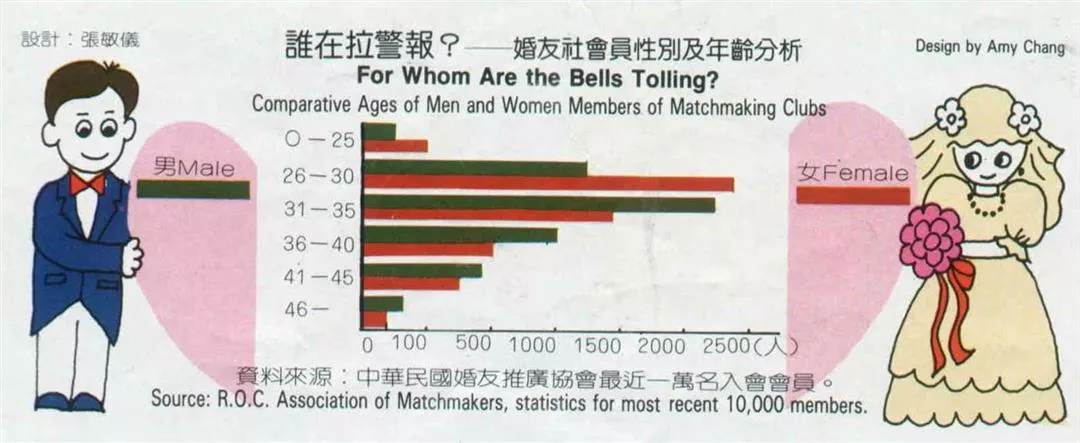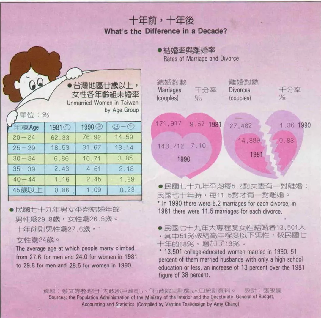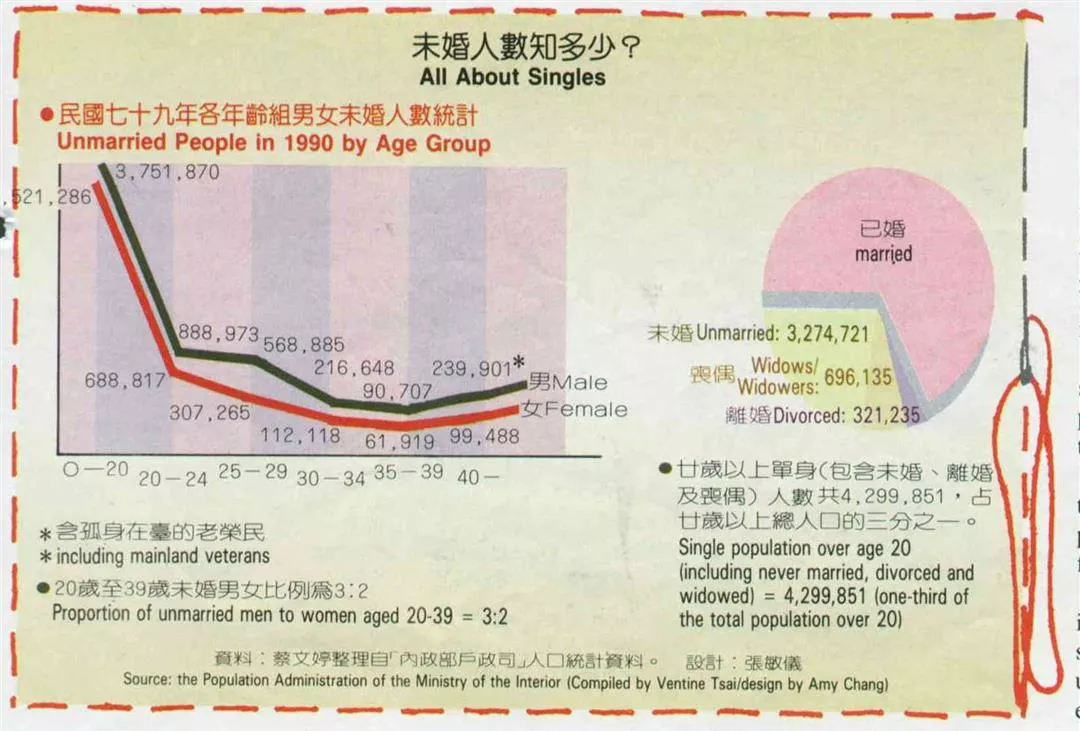 根據內政部戶政司最近發佈的數字,民國七十九年台灣地區廿歲以上人口中,有四百卅萬仍為單身,約佔成年人口的三分之一。而主計處「七十九年台灣地區婦女婚育與就業調查報告」則發現:廿至廿四歲的女性中,每百人有七十七人未婚;廿五至廿九歲組,平均三人中有一人雲英未嫁;卅至卅四歲的女性則有十分之一是小姑獨處;相較於十二年前的調查,未婚率分別提高了百分之十七、十四及六。