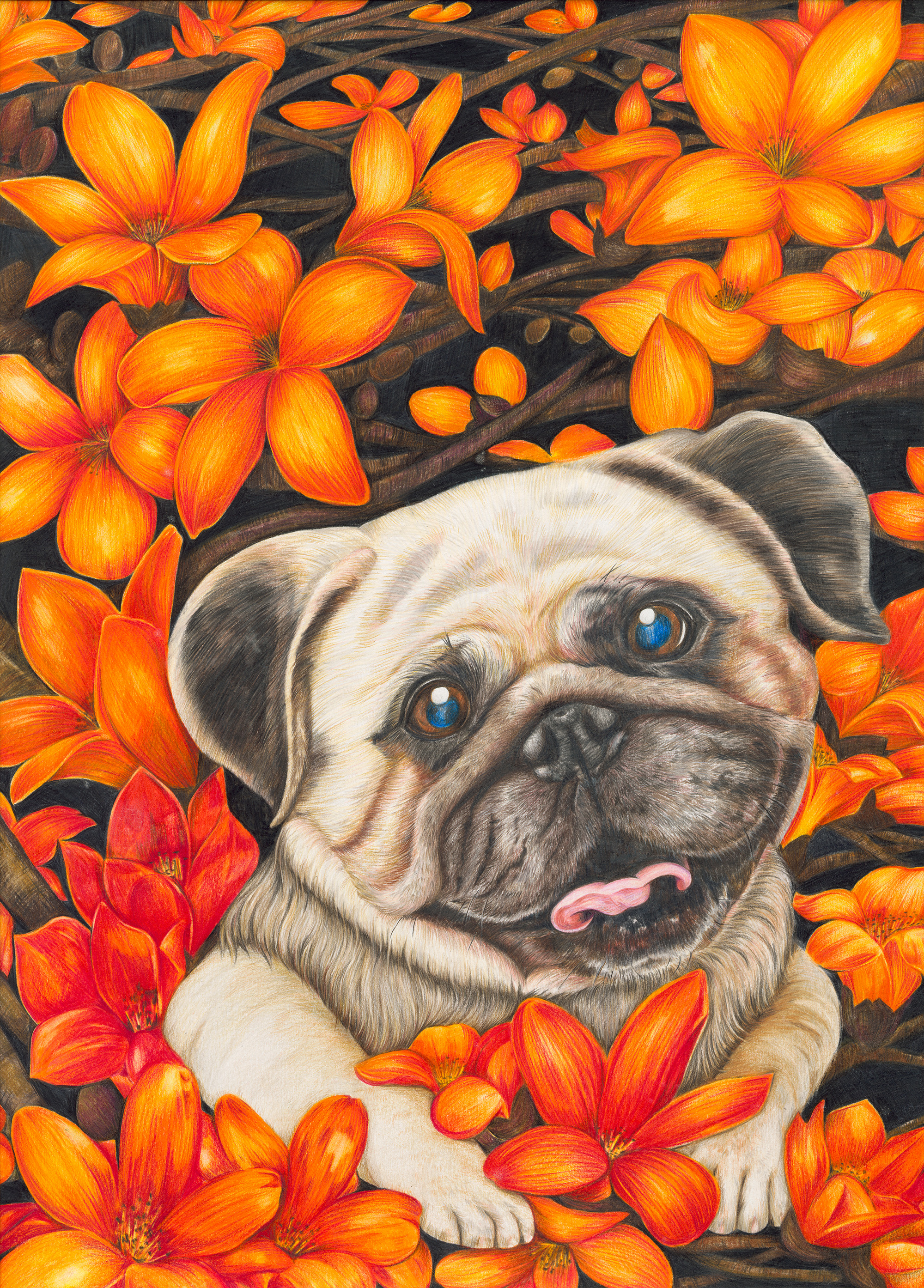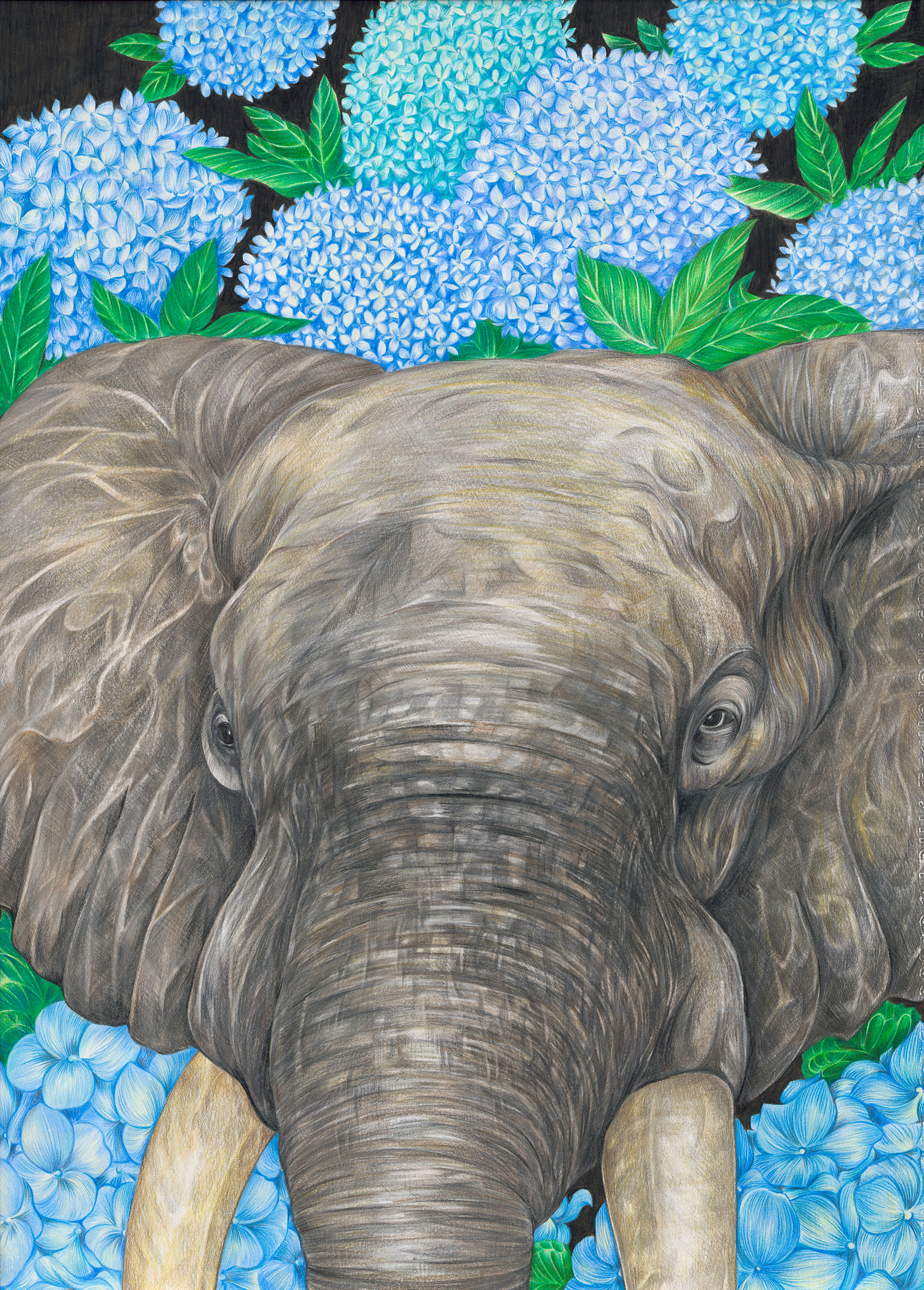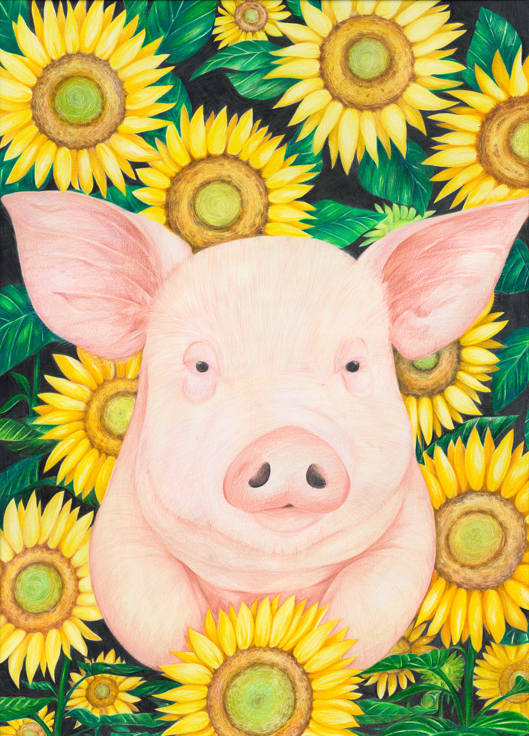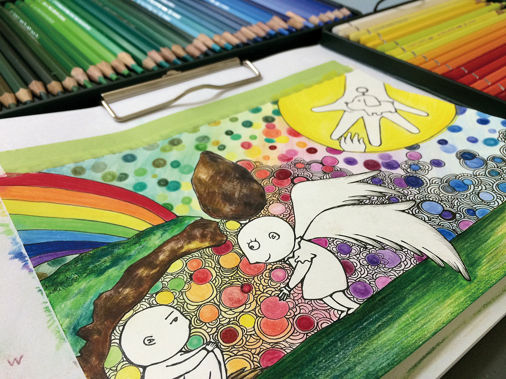 張椀晴的碩士畢業作品《彩虹下的希望》。動物象徵陪伴身邊的朋友,繽紛的花朵則代表了自己,當聚集在一塊,便猶如彩虹。