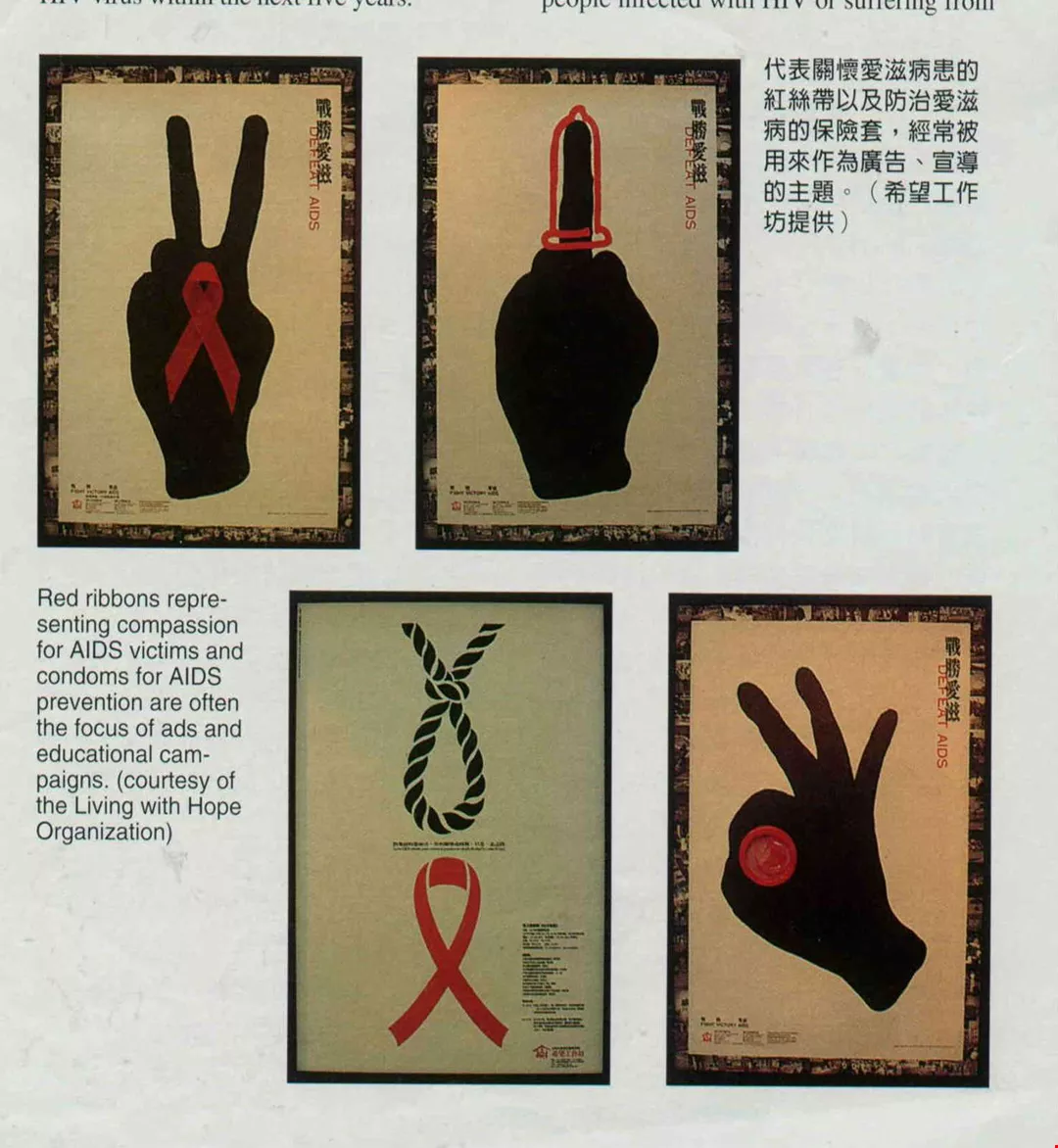 代表關懷愛滋病患的紅絲帶以及防治愛滋病的保險套,經常被用來作為廣告、宣導的主題。(希望工作坊提供。(張良綱)