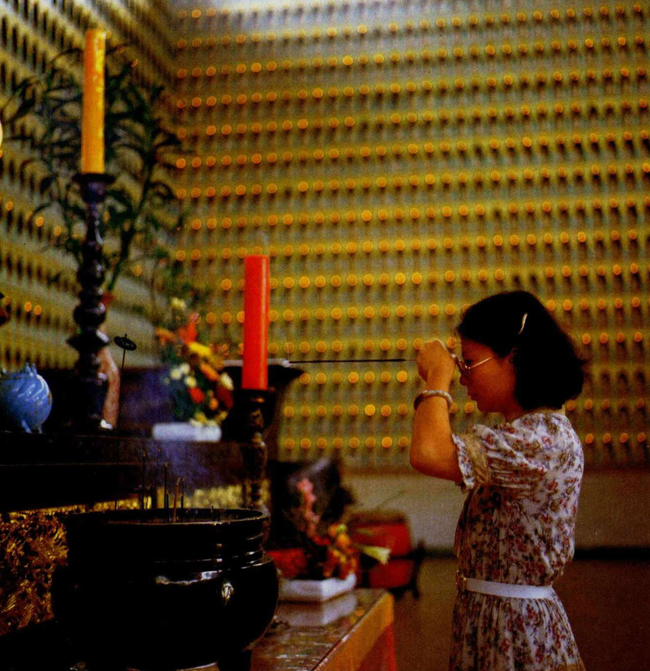 大殿的四面牆壁中,有一萬四千六百個小洞,每個洞中供奉一尊小佛像,洞的上方分別裝上小燈,下方則寫著認捐信徙的名字,稱為「光明燈」。當夜幕低垂,燈光齊亮,四面牆壁金光點點,有說不出的神聖莊嚴。