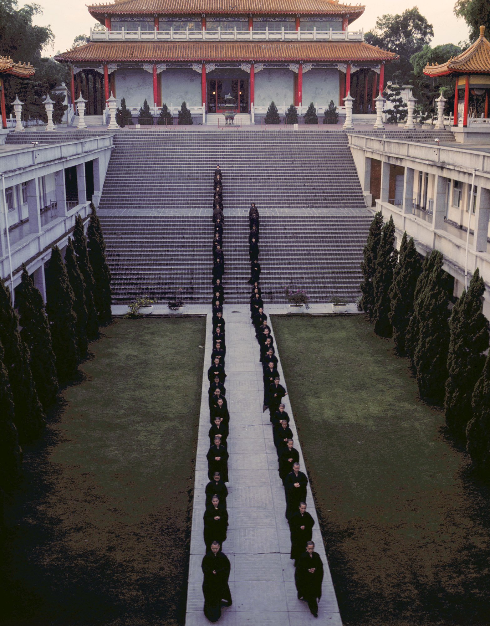 早課完畢,出家信徒魚貫的步出佛殿。