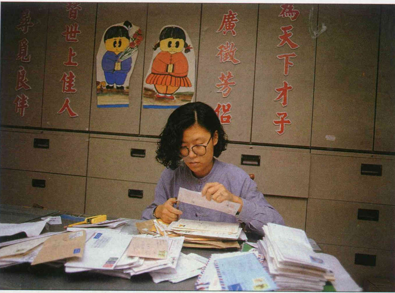 目前在每天平均二百封信件中,約五分之一來自海外,尤以留美學生最多。它們有一個特徵是:用電腦打的中文信特別多。「不曉得是旅居海外過久,怕中文字太醜,不願暴露短處,還是他們已習慣用電腦代筆」,處理信件的陳怡霏說。
