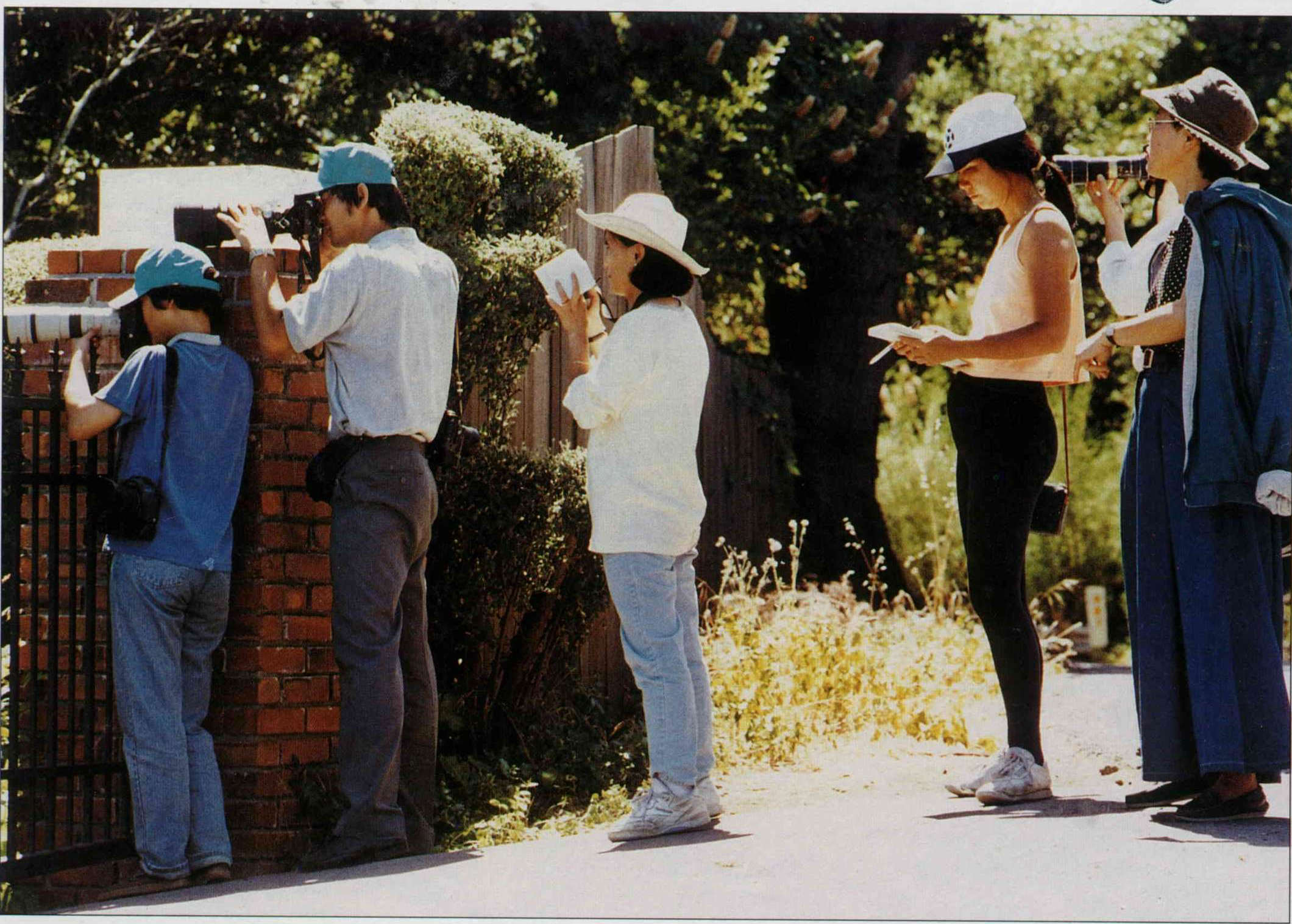 苦候林青霞在美住宅的台灣記者,對炙熱的太陽視若無睹,只想博得美人青睞,讓他們入門採訪。(張振賢攝)(張振賢攝)