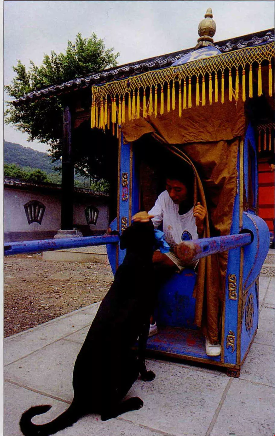 「包青天」劇中,有狗咬血書攔轎告狀一幕。為避免一再NG,訓練師在開拍前得先和狗多做幾次演練。(薛繼光攝)