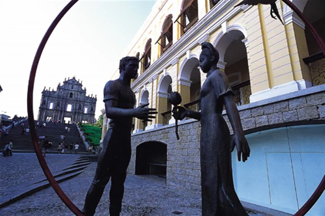 大三巴牌坊前一座公共藝術品,右方的東方女子和左方的葡籍男子相遇,訴說的似乎正是澳門曲折的近代史。