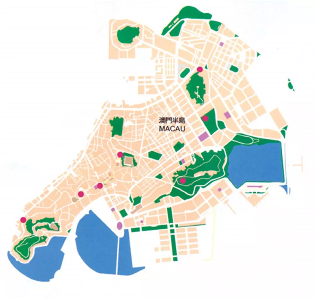 澳門歷史城區建築分佈,聖若瑟修院及聖堂,媽閣廟(廟中刻有葡萄牙船隻的大石),民政總署大樓,大三巴牌坊,東望洋砲台,普濟禪院,蓮峰廟