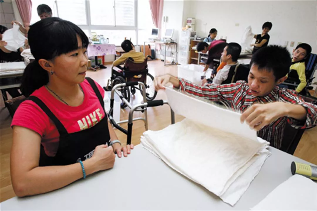 照顧一名智能障礙者,就是支援一整個家庭。國內對身心障礙者的服務,從傳統以照護、隔離為主,逐漸轉為重視發展潛能,強調個人能力與生活環境的相互配合。圖中的腦性麻痺學員正專心地摺疊尿布。