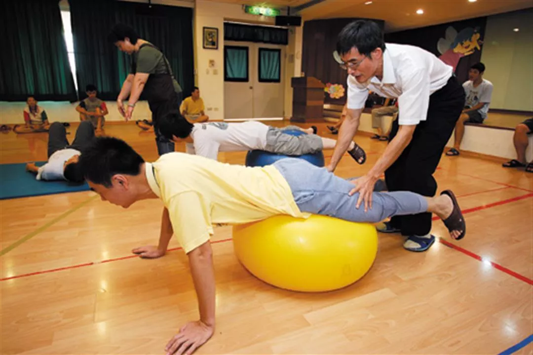 「馬利亞霧峰家園」的綜合教室內,一群大孩子正在老師陪伴指導下,鍛鍊平衡感、肌力與動作協調能力。