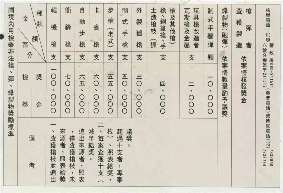 警民合作方面,刑事警察局發佈了國境內檢舉非法槍、彈、爆裂物獎勵標準(見表),鼓勵民眾利用一一○電話與八號分機檢舉。張科長也特別強調警民合作的重要性,因為它正是打擊犯罪的不二法門。