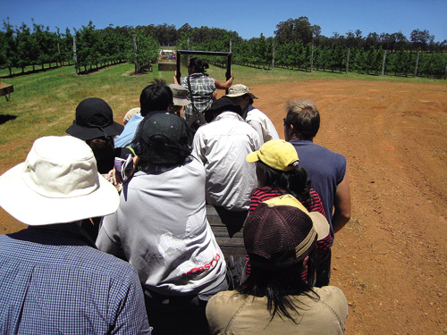 在西澳的蘋果園打工時,林后渝每天都和各國背包客一起坐拖引機上工。