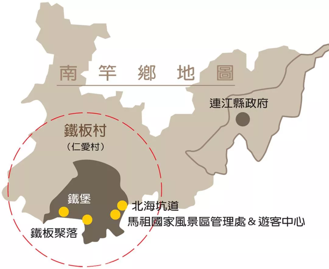 夾在馬祖南竿島的二個軍事地標──深藏地底、鬼斧神工的「北海坑道」和聳立於狂濤中的花崗岩碉堡「鐵堡」──之間,鐵板聚落(仁愛村)過去向來是觀光客過門不入的不起眼村落。