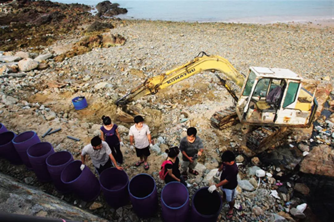 「怪手是向做工程的朋友調借的,省了原本二天要1萬2,000元的租金,」他說。理事長陳其運則身手矯健的攀爬在海堤上陡峭的污水出水口,把即將完工的過濾桶接管過去。