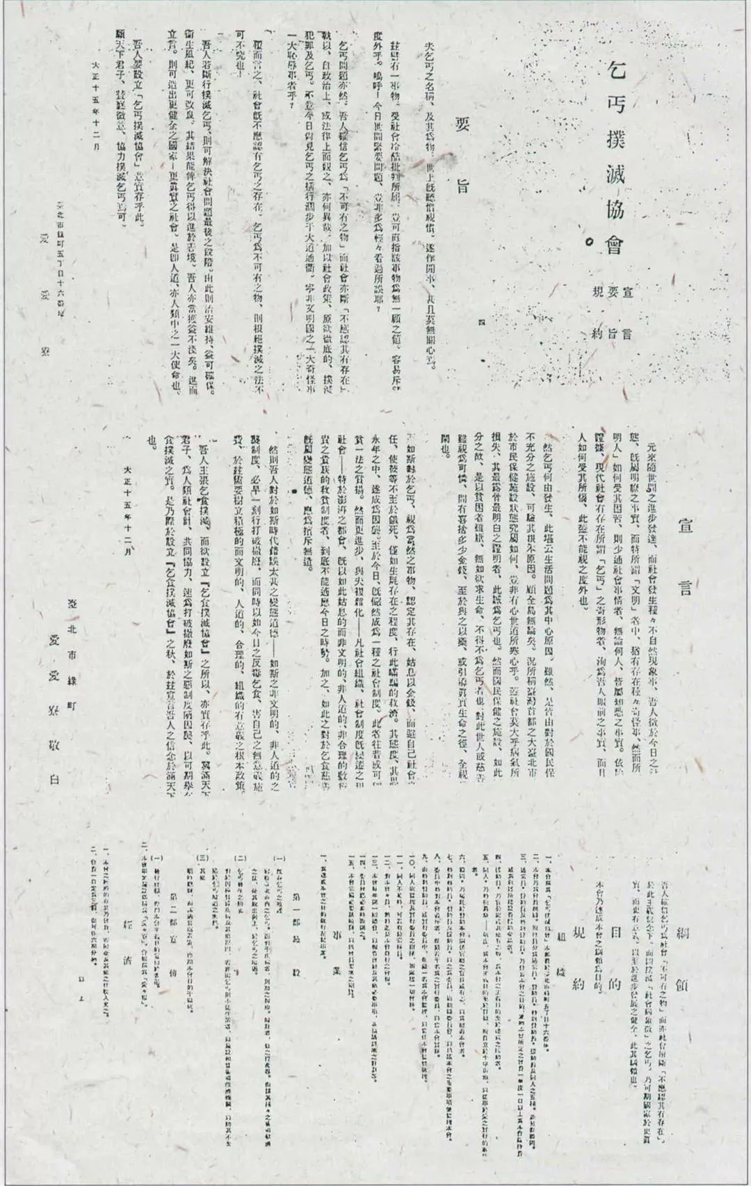 施乾於一九二六年成立「乞丐撲滅協會」,號召社會賢達,共同撲滅乞丐,宣言中提出解決之道。(台北縣立文化中心提供)