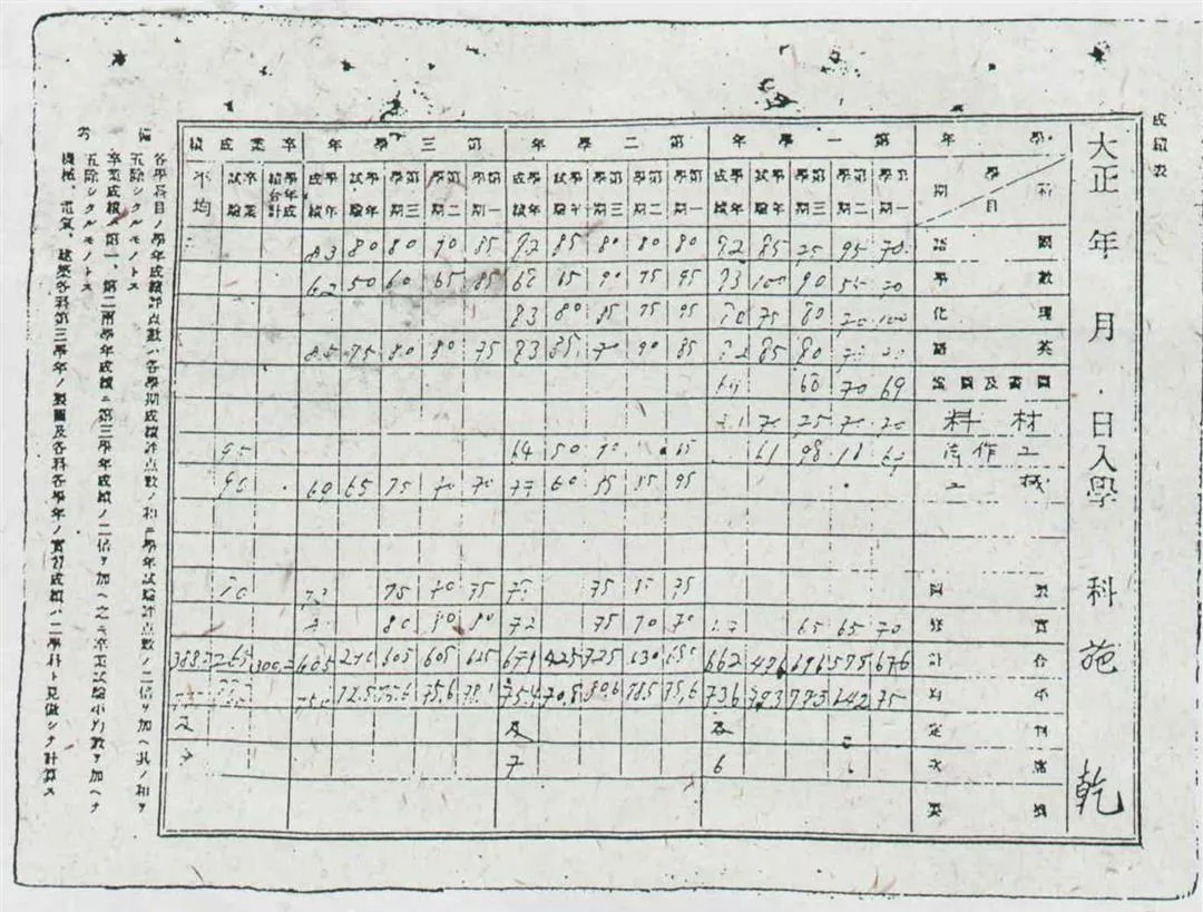 在台北工專發黃的資料堆中,找到了這張一九一四年施乾的成績單,他以全班第五名的成績畢業。(台北縣立文化中心提供)