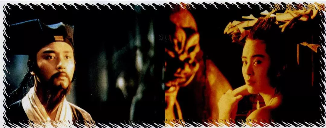 美若天仙、不沾一絲鬼氣的聶小倩在案前提筆做詩,「十里平湖霜滿天、寸寸青絲愁華年;對月形單望相護,」小倩停筆思索著最後一句,卻被姥姥打斷、喚她前去伺候。在外觀看的書生寧采臣走到案前,接下了最後一句「只羨鴛鴦不羨仙」。霎時,原本荒蕪的水池,綻開了一朵朵的荷花,原本無色黑白的影片,蛻幻出一片生氣色彩,展開了書生與女鬼的一段浪漫情愛。