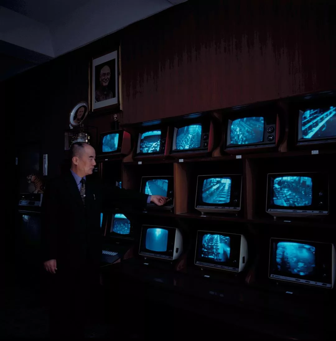 典獄長王肇泰經常從閉路電視上,觀看監獄內各管理員監督及受刑人工作的情形。(曉陽)