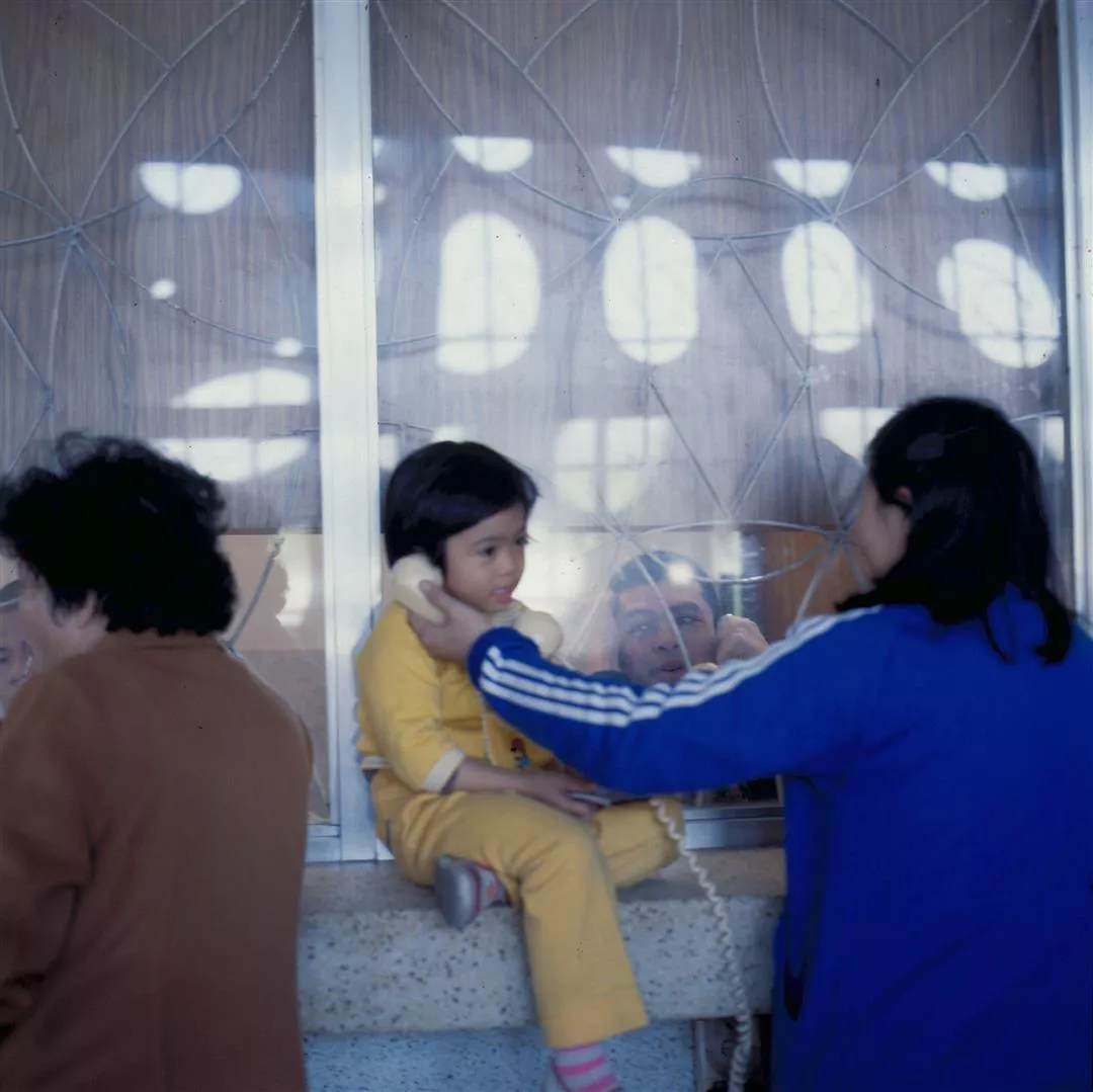 在另一個窗口,一個年輕媽媽手中抱著個胖娃娃,娃娃拿著話筒開心地叫:「爸爸!爸爸!」爸爸在玻璃另一邊淚眼朦朧,他一定也想把這可愛的胖娃娃抱進懷中,緊緊地摟他、親他,但是他不能……。