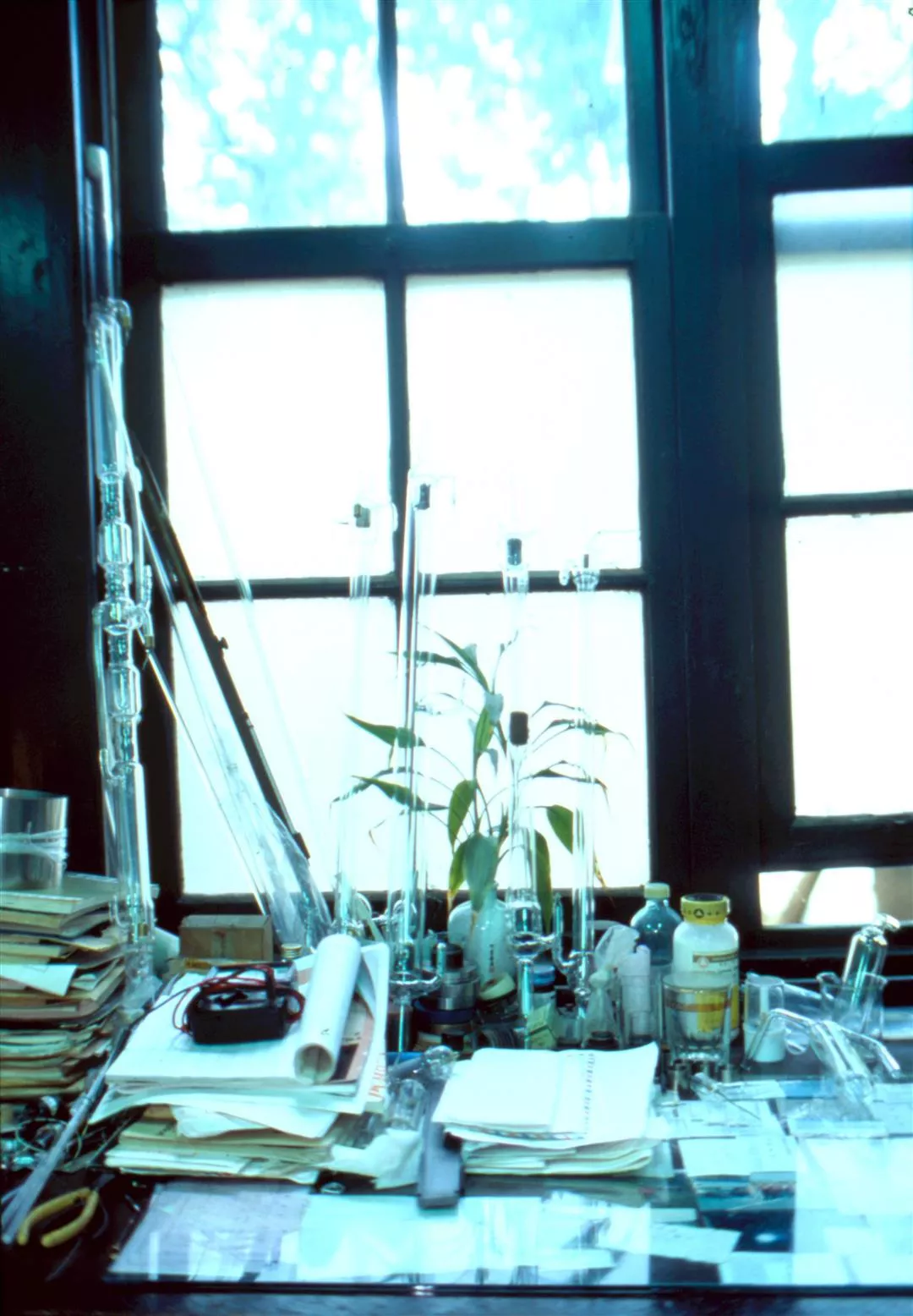 這個近十坪的房間,約有二個半成人高,牆面油漆剝落,主人的櫃櫥、書桌、工作檯、圓形椅凳、水龍頭栓……,都看得出來已在此度過半世紀的寒暑。而最新、最亮、最乾淨、最惹人注目的,是或放在長方形工作檯上,或立在其旁的長條形、漏斗狀、橢圓球形……的玻璃管、瓶、杯。