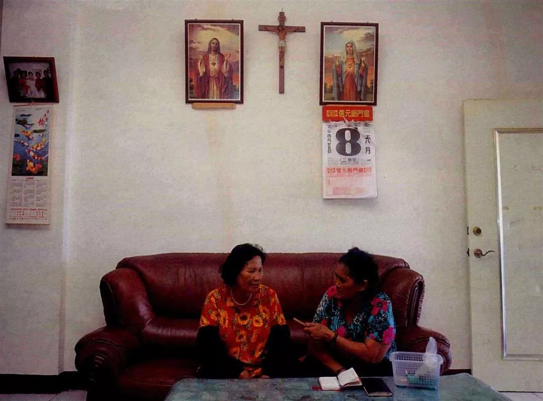 拉拜•多鉻(右)就在高掛基督像和十字架的客廳為人施法,傳統和外來信仰在這兒並不衝突。