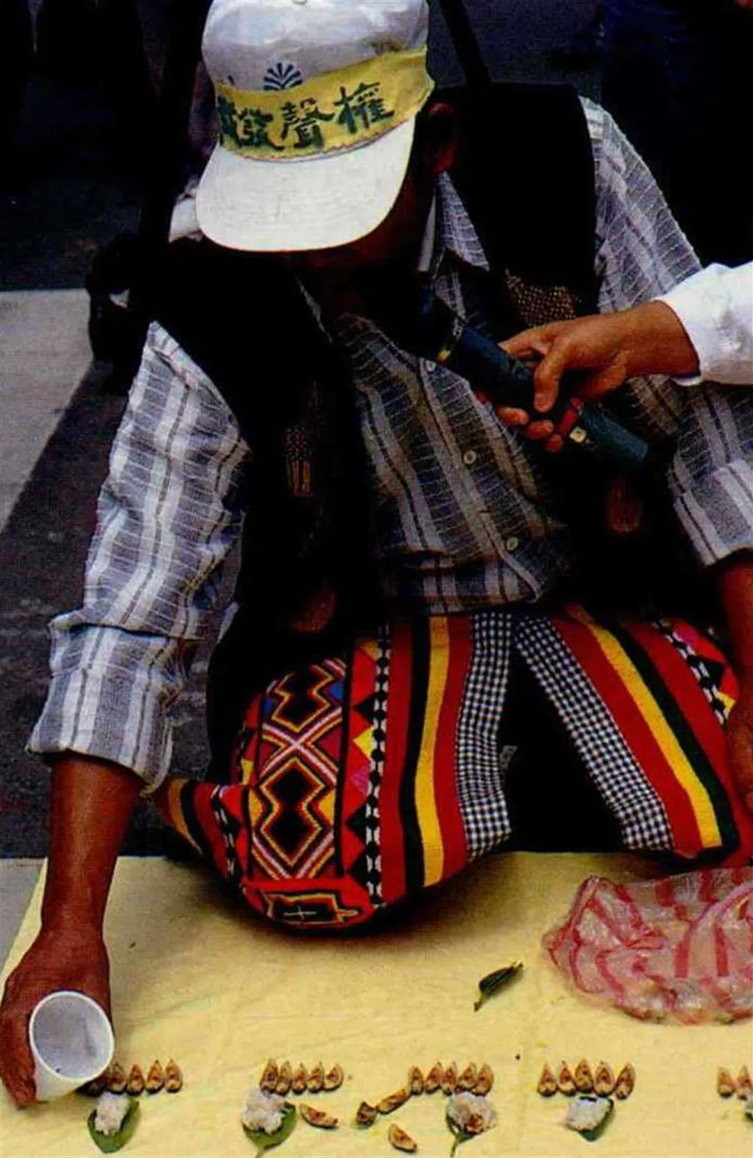 檳榔也是卑南巫師的重要法器。圖為一九九七年,公共電視法的審議過程陷入膠著,吉凶未卜之際,卑南巫師應邀前往立法院前做法,公視法後來果然順利三讀通過。(卜華志攝)(卜華志攝)