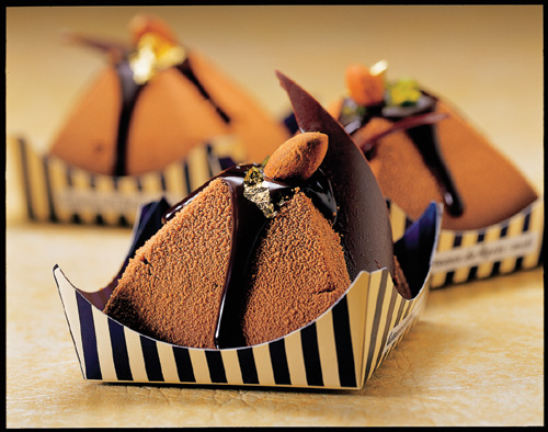 (左上)金字塔、黑棗瑞士捲(左下)、芝麻巧克力(右上)、草莓優格(右下),經由中央廚房統一製造出來的各式蛋糕,無論在選材和造型上都透著嚴謹和巧思。