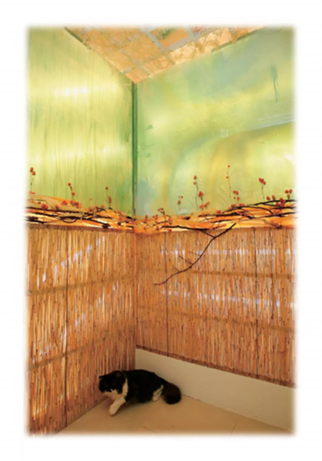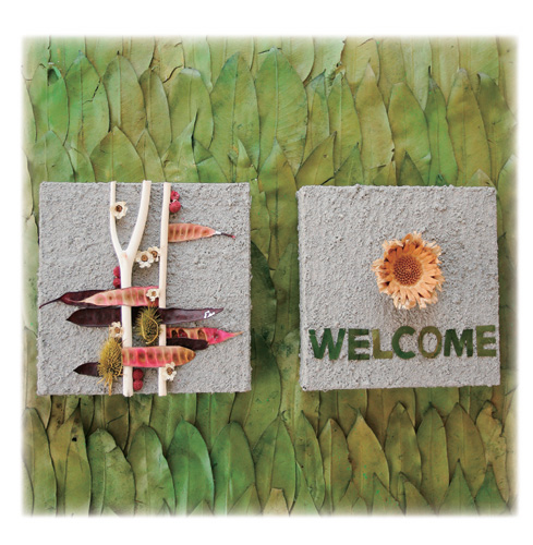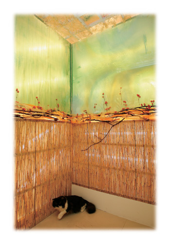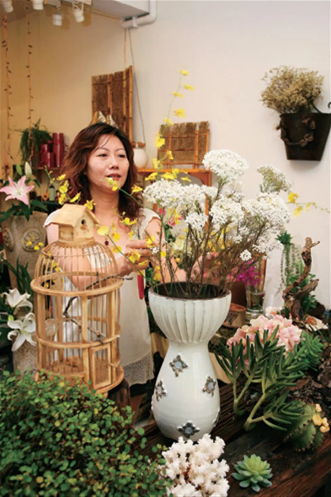 工作室還有些雜亂,入門一幅「山」的畫作,是陳以瑜把乾燥花當素材,在「框」裡佈置的得意之作。牆面上掛著由各式花材、葉材或樹枝編織而成的燈飾、掛鐘、畫作等,只是她的一小部分作品,更多的藝術創作散見於大台北各地的SPA中心、百貨公司櫥窗、渡假溫泉旅館的空間設計。譬如農安街上一家販賣由紐西蘭進口的化妝品小店,潔白亮麗的內部空間,就以垂懸的透明葉片與花飾佈置天花板,配合燈光投射,有種呼吸到紐西蘭清新空氣、陽光、水的感覺。