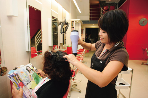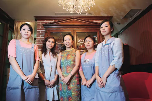 典型女性創業的美容瘦身保養集團「完美主義」,女性員工高達99%。為了讓資深員工可以創造自己的未來,3年前總公司開始輔導員工內部創業。圖為「完美主義」大直加盟店,老闆黃敏(中)原在媒體任職,6年前離開職場自行創業。