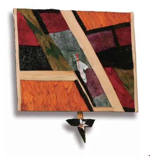 陳以瑜的幾件代表作品:工作室的歡迎璧飾、花飾掛鐘、化妝品小店的牆面裝潢。