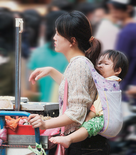 如果不是為了養家活口,「袋鼠媽媽」也不會背著孩子、推著小餐車,辛苦地外出謀生。