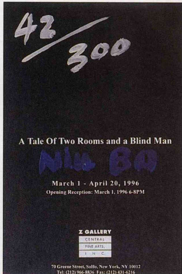 「Z」畫廊今年三月舉行牛波個展,主題為「二個房間和一位盲人的故事」。展覽廳就是兩個房間,一個全黑,參觀者頓成盲人,通過該房間後進入明亮的「白屋」,內有一位真正的盲人,傾聽參觀者對黑房中感覺的描述。這張以黑色為底的邀請函,和展覽一樣別緻。(張張提供)