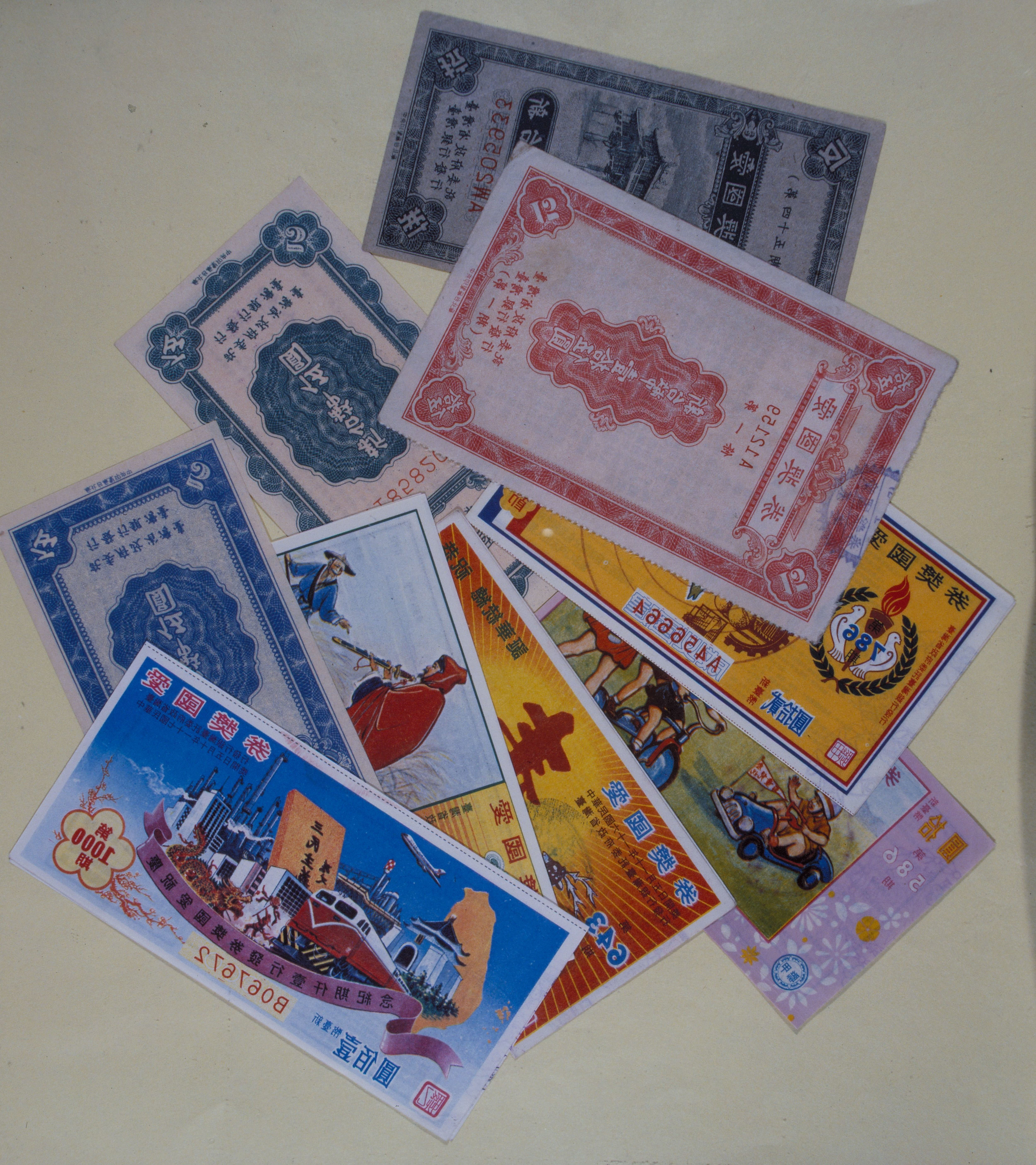 各期愛國獎券,右上角紅色的那張是第一期獎券,左下角是第一千期獎券。(曉陽)