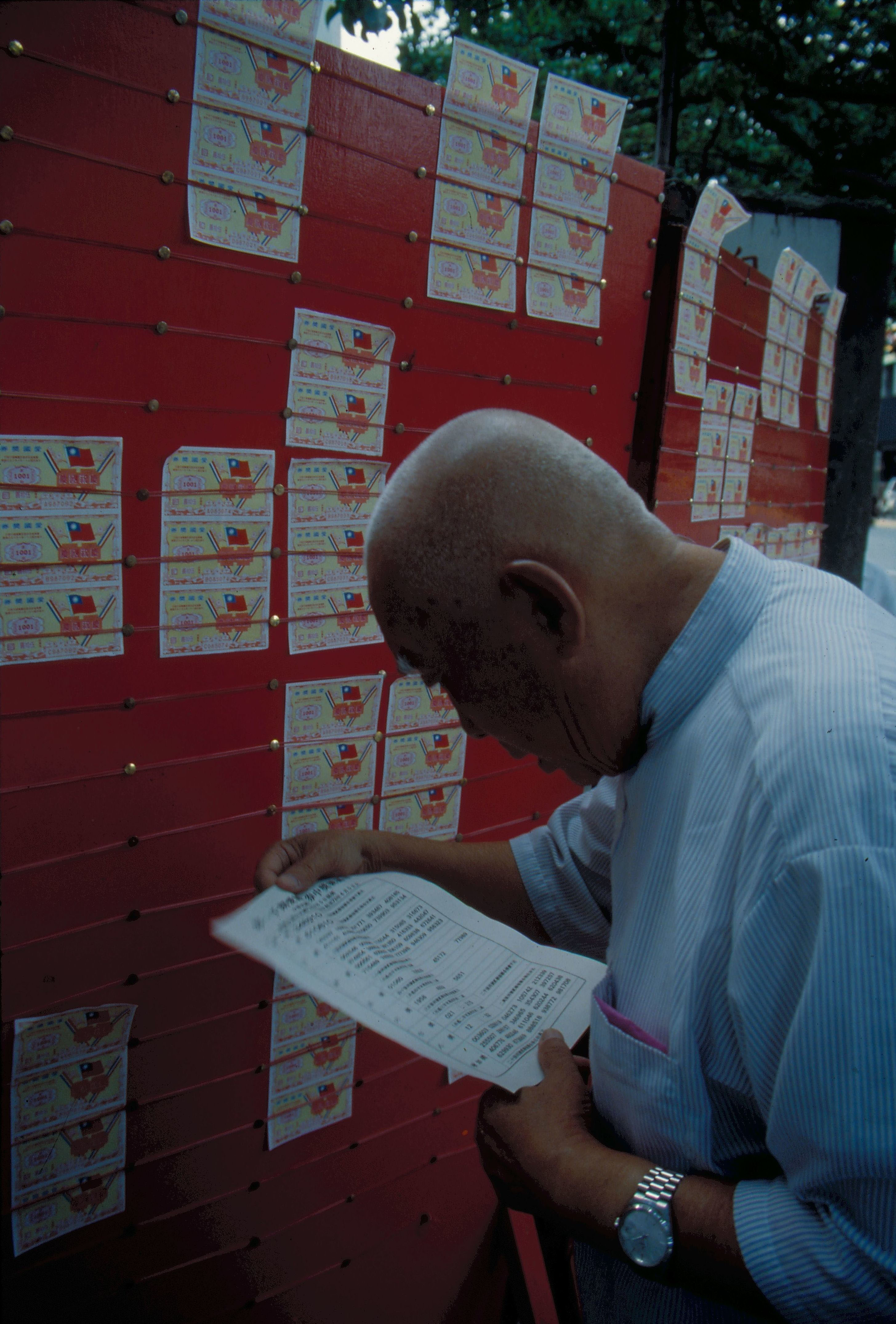 買愛國獎券得細細選,老先生詳看上期的中獎號碼單,希望由裏面得點兒靈感。(曉陽)