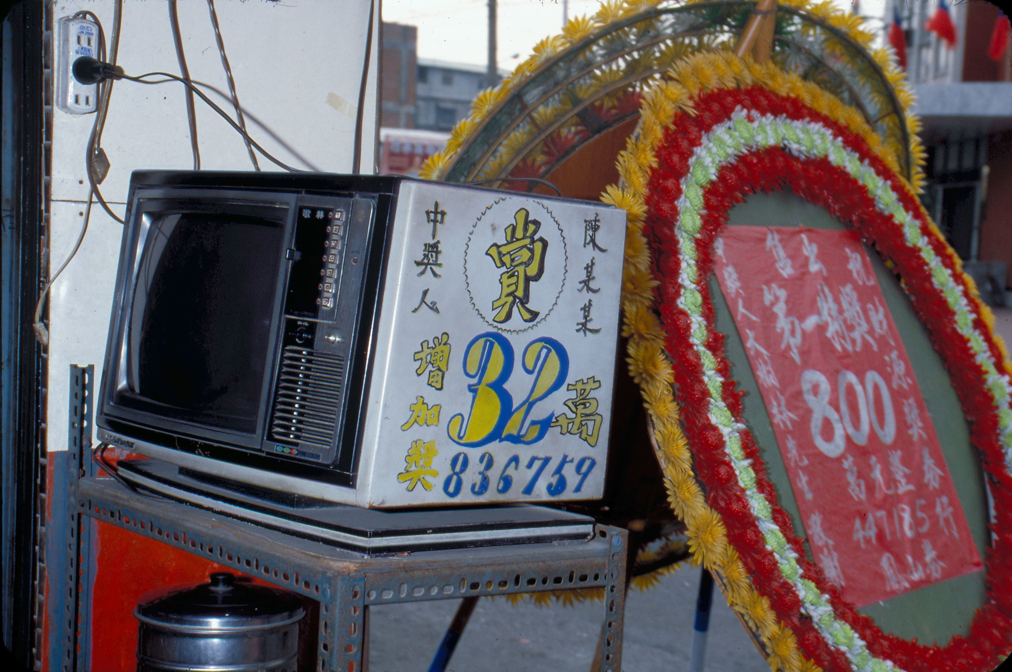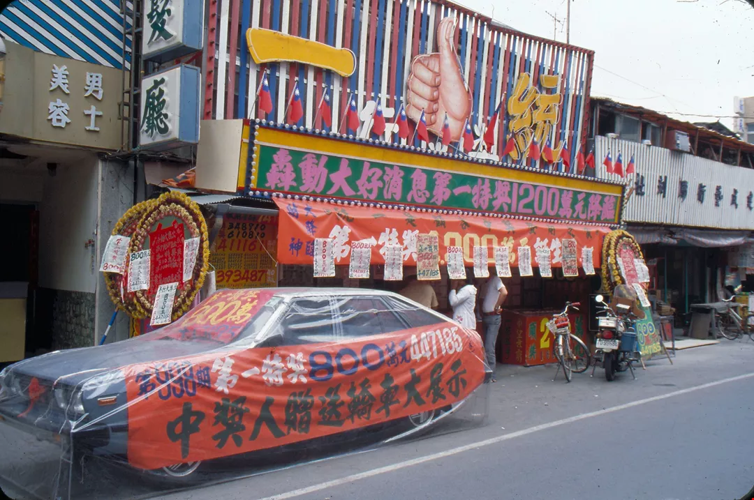 有店家嫌紅紙會褪色,甚至長期在門口擺著機車、電視機、汽車,或在店面懸掛金牌、貼滿百元大鈔的喜幛,標明是某人中獎答謝,以加添來客中獎信心。