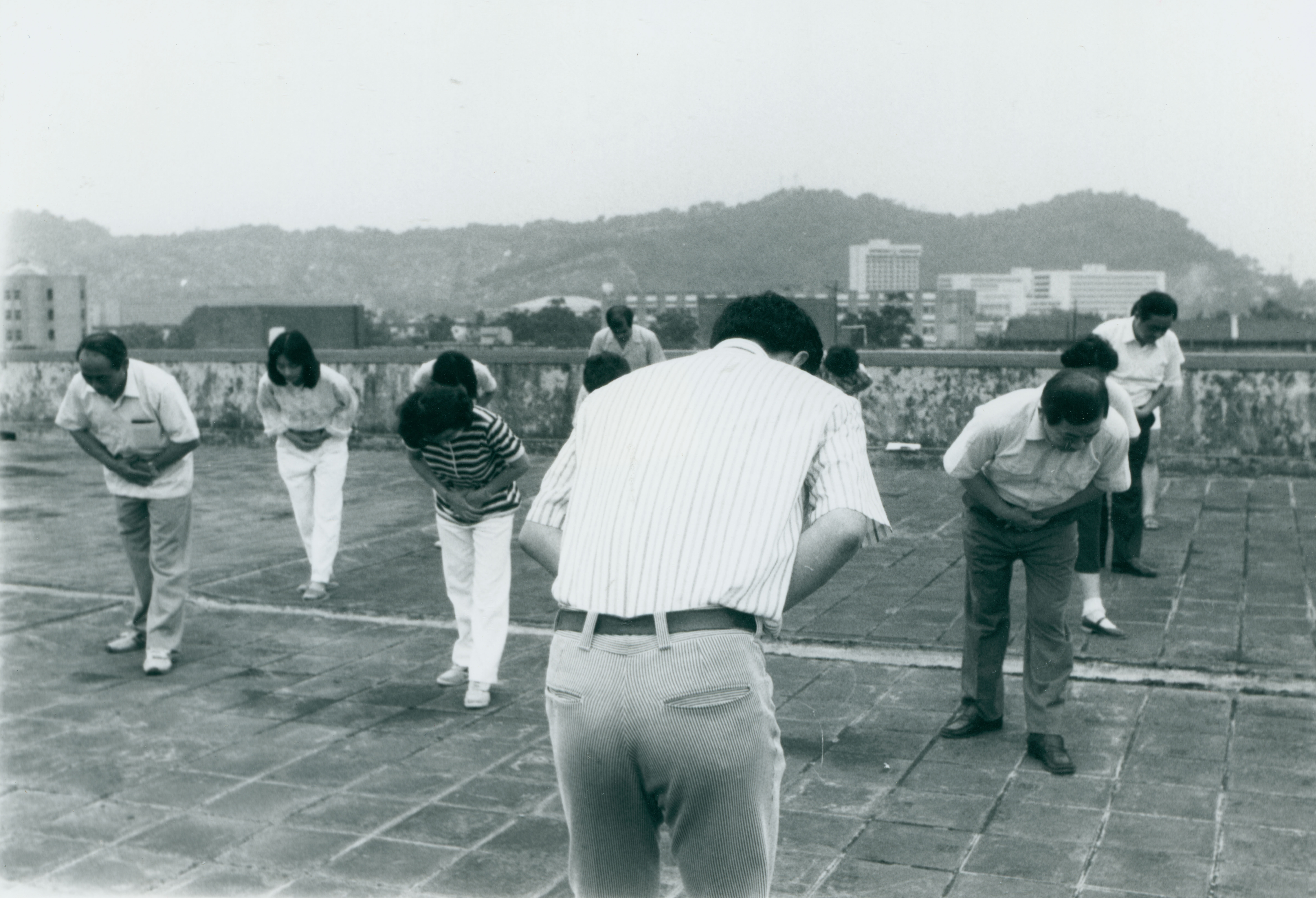 「集體肚子痛?!」可不,他們是在練第二式「龜息吐納功」。(鐘永和)