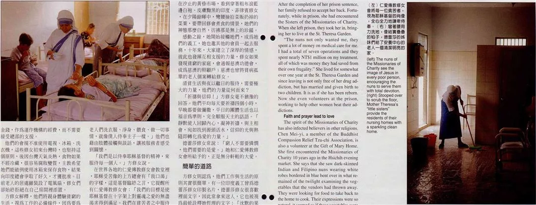 他們的精神也感染了其他宗教的門徒。佛教慈濟功德會委員陳美羿,也是台北汐止瑪利亞恩賜之家的義工,她和仁愛傳教修女會的結緣,起始於十年前她在汐止的黃昏市場,看到穿著粗布滾藍邊白袍、皮膚黝黑的印度、菲律賓修女,在夕陽餘暉中,彎腰撿拾菜販扔掉的菜葉,要帶回修會煮食的情景,她們的神態那麼自然,彷彿那是無上的珍饈。