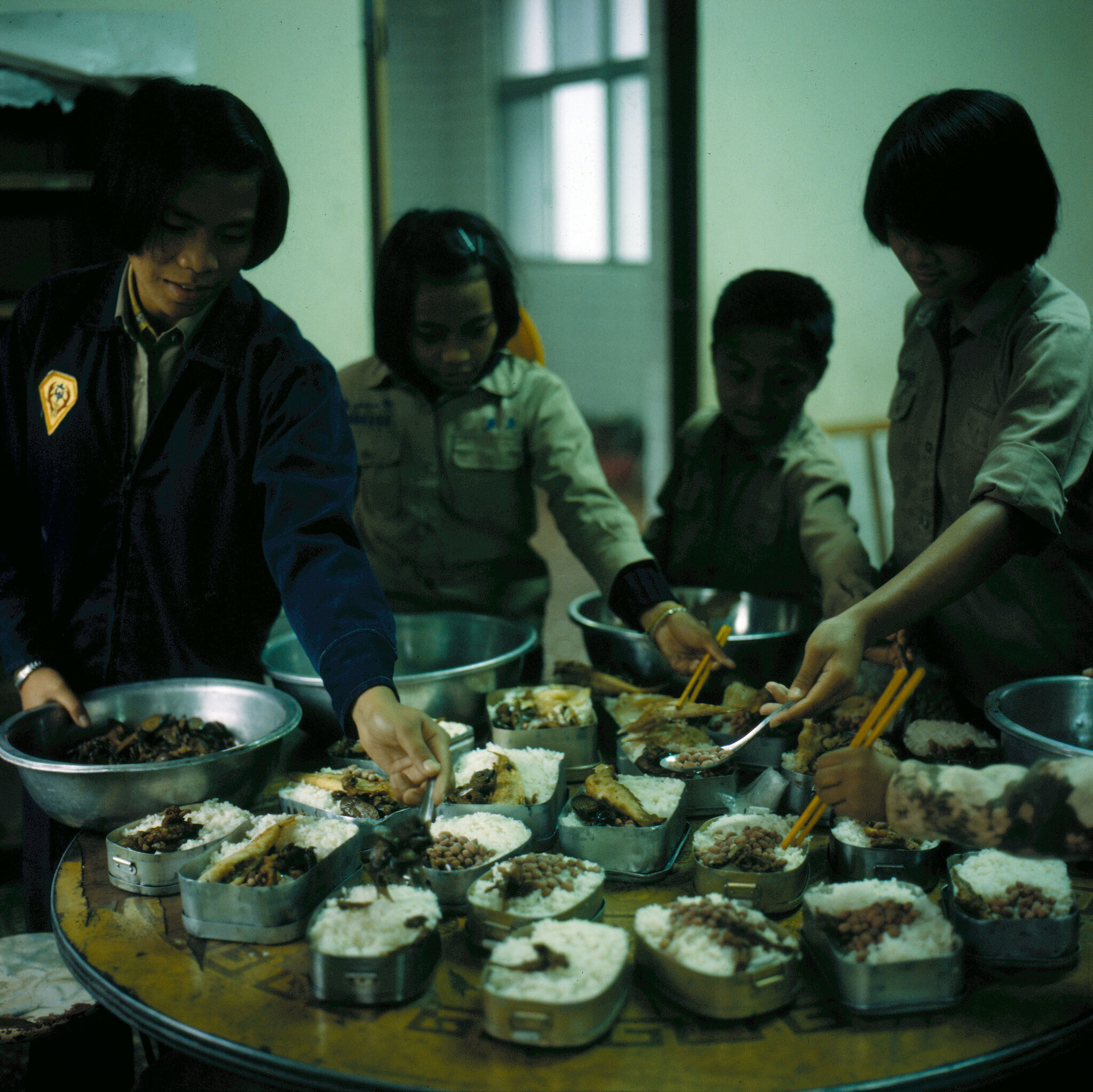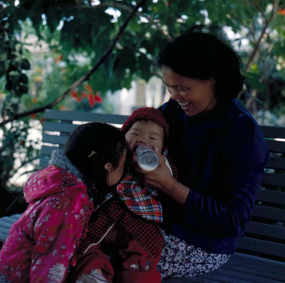 清晨五點,一潭深水似的天空仍然凝浮著冷冷的薄霧,微暗中我們信步所至的四處漫走。廚房的大灶燃著熊熊爆升的火光,白色的米粥在深大的鐵鍋中滾滾沸騰著。褓姆們洗菜切菜,身邊還繞著打轉的稚齡孩童。而楊媽媽正在忙著分配卅多個便當的菜食,有炸魚塊、青菜、油豆腐,塞得滿滿的。楊媽媽一直是鉅細兼顧地在照顧著全院孩子們、員工們的生活。