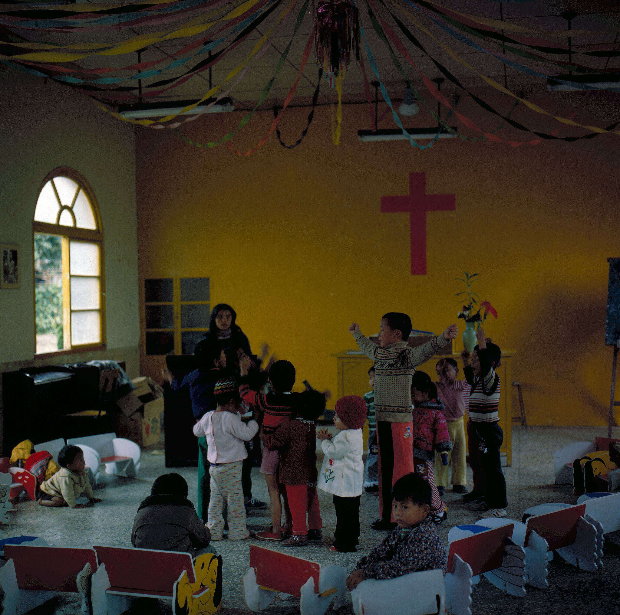 教堂裡,一部份做完自己事務的孩子正由小組長領著做晨更、讀聖經、朗誦荒漠甘泉。最後楊牧師起來帶著大家禱告:「早上起來看見陽光照著我們,就是主礙漸照著我們,請帶我們平安到學校,平安地回來,也求祢賜給我們健康、智慧……我們滿心感謝讚美祢…。」禱告尚未結束,有些孩子已與身邊的玩逗起來。一個大孩子一睜眼看見外面楊媽媽在搬罐頭食品,趕快躍起出去幫忙。六十多歲的楊牧師仍然閉目,專注虔敬地祈禱著,沒理會孩子們的動靜。晨光亮麗悄柔地射了進來,我忽然感覺他們之間隨時隨地都有一種恬適滿足的怡然意趣,我也感覺出一位溫厚的長者與孩子們共融的是一片多麼平易單純的情愛。子江說:「爸爸是個老好好。」相信,在這片自然祥和的天地裡,楊牧師也漸漸變成像他的孩子一般了。正如聖經上所說的,「你們若不回歸孩子的式樣,就斷不能進我的國。」