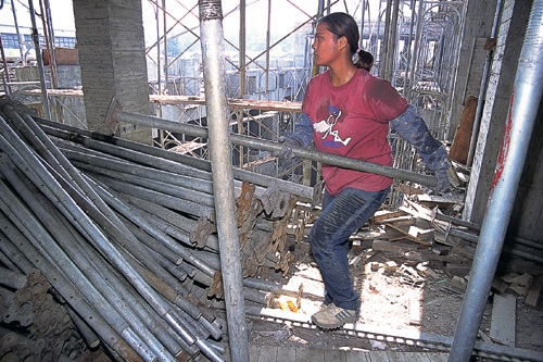 在工地的鷹架上擺盪,