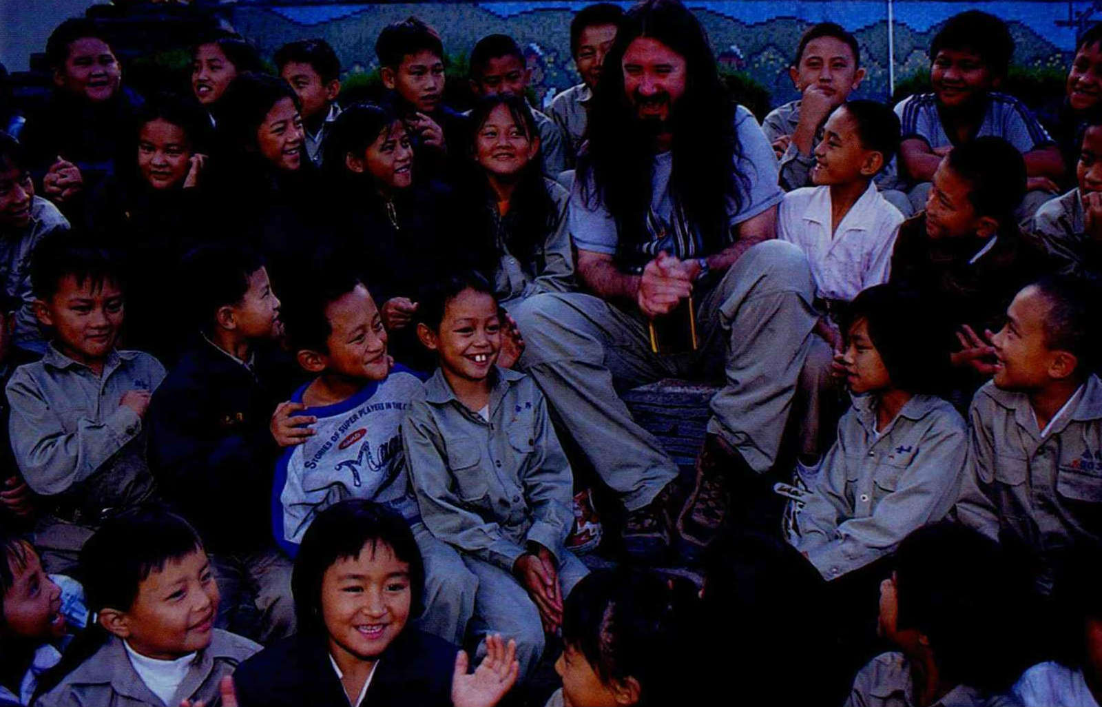 馬修最喜歡小孩,每到一處國小就會表演或耍寶逗孩子開心。圖為馬修在霧社的合作國小拍節目帶,全校七十個學生大概都到齊了。